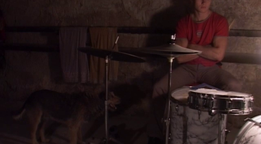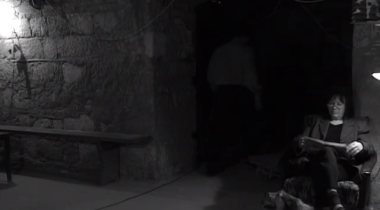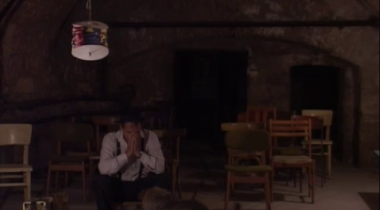 A Szentkirályi színészvezetésének lényeges eleme, hogy a színészt nem vezetik. A külső szem maximum a partner, főleg Monori. Fontos viszonyítási pont továbbá az állati jelenlét és a pince anyagisága. Az emberi szó, tekintet, mozdulat, mimika akkor érvényes, ha legalább egyenértékű az állatéval, ezen előadás esetében Gina kutyáéval, akinek szemében szintén ott van a közös múlt.18 5. KÉP Monori olyan mélyen komolyan veszi őt, amikor az újraszületést tanítja, mintha ember lenne, ezáltal partnerré teszi. Mindez érezhetően nem eljátszott dolog, a szó azon értelmében, hogy nem külső megfigyelő meggyőzésére tett szándék, hanem valódi kapcsolatfelvétel a másik élőlénnyel. Ugyanígy: a színészi eszköztelenség azonos a pince érintetlenségével. A párbeszédek, monológok hangvétele olyan, mint egy esti beszélgetés a konyhában.19 6A KÉP 6B KÉP Természetes középhang, az apró, ártalmatlan vitákkor a nyomatékosság kedvéért azért megemelve. Finom kontrasztokkal emelik el a színészi jelenlétet, annyira óvatosan, hogy sose legyen szembetűnő.20 A kevés párbeszédes jelenet egyike, amikor Monori ül a fotelban és állathirdetéseket olvas föl. Hangosabb és élénkebb, mint Székely B., jelentősen többet beszél nála. Kellemes, csevegő tónusban olvassa a hirdetéseket, kissé utasító hangnemben szól partneréhez. Hangszíne, élénksége hasonló minőségben pezsdítik fel a légkört, mint amikor egy későbbi jelenetben Gina kutya a Székely B. lába előtt heverő teniszlabdát szuggerálja izgatottan, a férfi pedig a Lassú teher veseátadós, kölcsöntüdős szakaszát mormolja, és nem rúgja el neki a labdát. A párbeszédekben Székely B. látszólag passzív marad, megszólalásai fojtottabbak, szinte mindig csak a másik mondatára adott reakciók. Kisétál a Monorival való párbeszédből és a korábban, az előadás részeként berendezett székek között harmonikázik, majd elénekli az Akácos út című nótát. Kicsit hamisan énekel, ritmustalanul, mégis, ahogy kalapban, zakóban, az őt figyelő nőnek háttal harmonikázik, a szabadságért való küszködés szorongató vonzereje árad belőle. 7. KÉP Horváth Sándor Farkas érkezésekor levelet hoz, amelyet a ház gondnoka, Kaposvári bácsi küldött.21 Kioktatja Monorit és Székely B.-t, hogy nem tudnak dobolni. Megmutatja nekik, hogyan kell jól csinálni, majd miután nem kap a marhanyelvből, eltűnik az egyik teremben szaxofonozni. Keresetlen gesztusaival, külső adottságaival, határozott, mégis nyugodt jelenlétével erőteljes, sugárzó férfi benyomását kelti. Magas, izmos fizikum, hirtelenszőke haj, bőrdzseki, piros póló. Nem olvad bele a környezetébe, önmagában vibrálást kelt, ami megint fontos, mivel eljátszott vagy hordozott feszültség nincs az előadásban. Így válik az emberi test is kontrasztképző hatáselemmé.