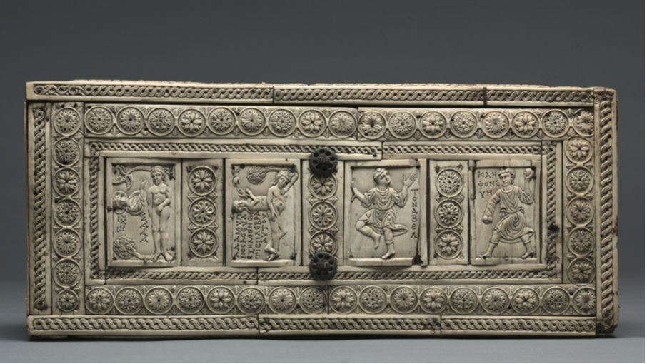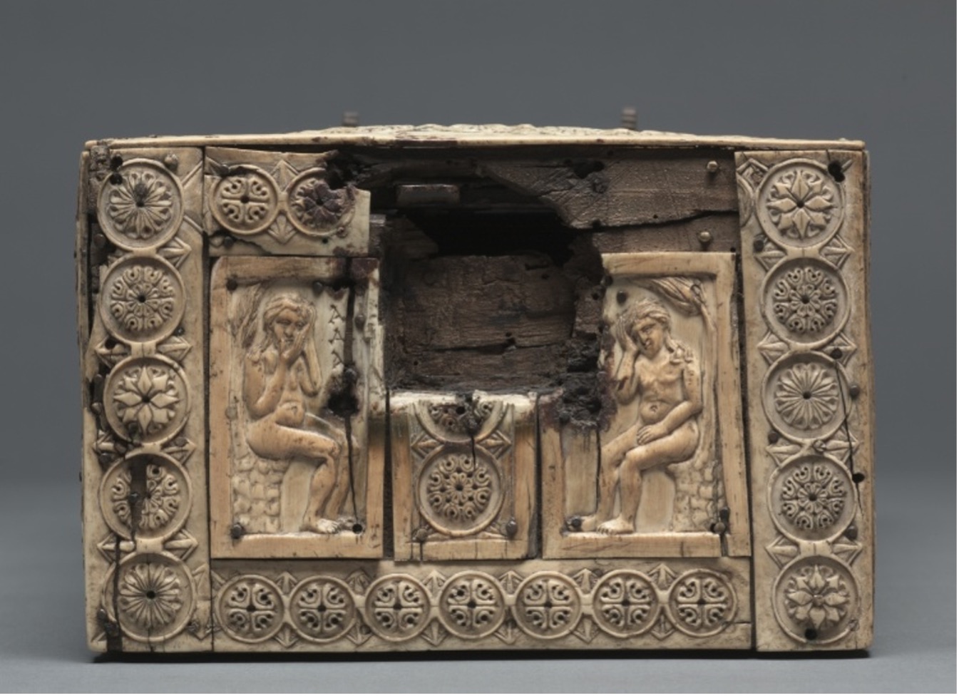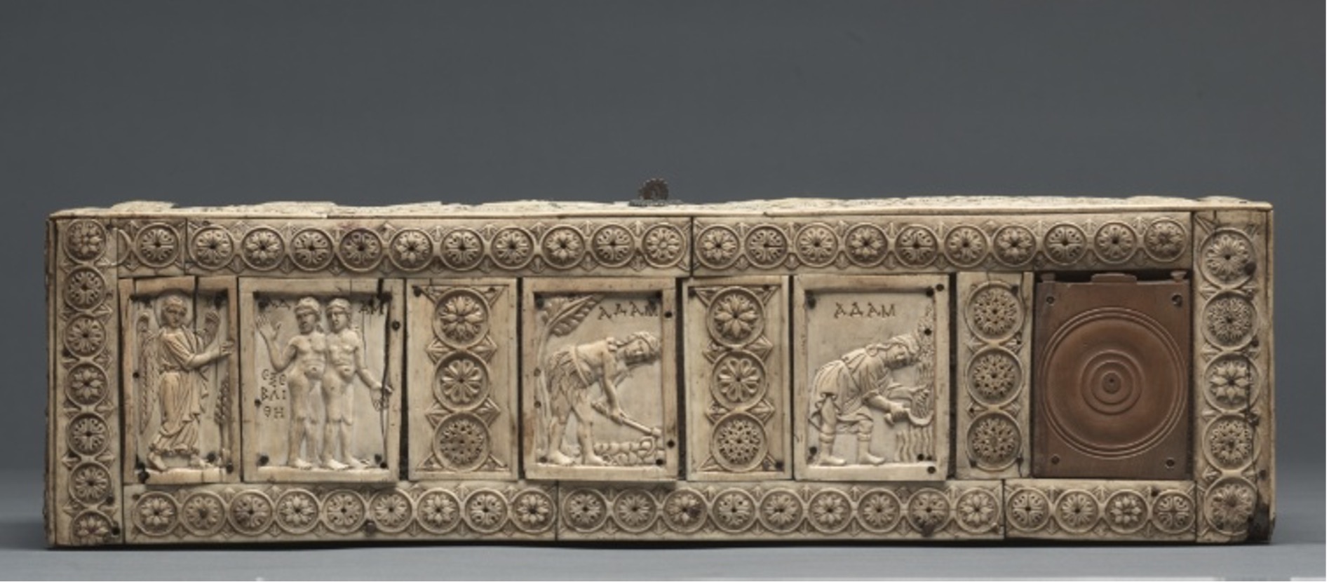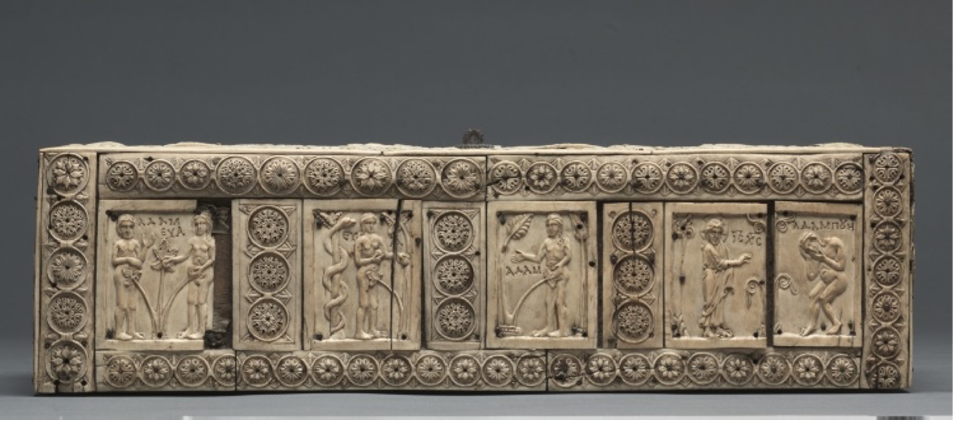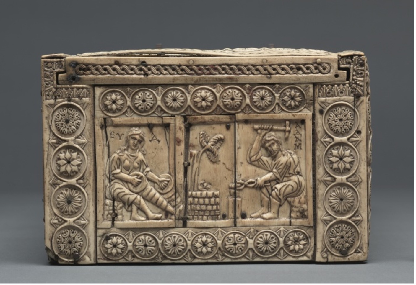 A 4. század után a bárány és kéve háttérbe szorul, de ezzel egyetemben megsokszorozódnak Ádám és Éva földi szenvedésének és kemény munkájának illusztrációi.7 Jó példa erre a Cleveland Múzeumban kiállított elefántcsont doboz, amely 14.3 x 46.7 x 20.3 cm méretű, elkészültét pedig Kr.u. 1050-re teszik. Az ilyen és ehhez hasonló dobozkákat egyes források szerint ékszerek és kisebb értéktárgyak tárolására használták, míg másikak szerint eukarisztiai kenyér volt bennük tartva és csak a legtehetősebb bizánci lakosok és templomok tudták megengedni maguknak az elkészíttetésüket. Ezen konkrét tárolóegységet konstantinápolyi mesterek alkották.8 A dobozon lévő összesen 16 lapos dombormű történetmesélés szempontjából igen érdekesen van felosztva.