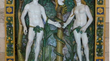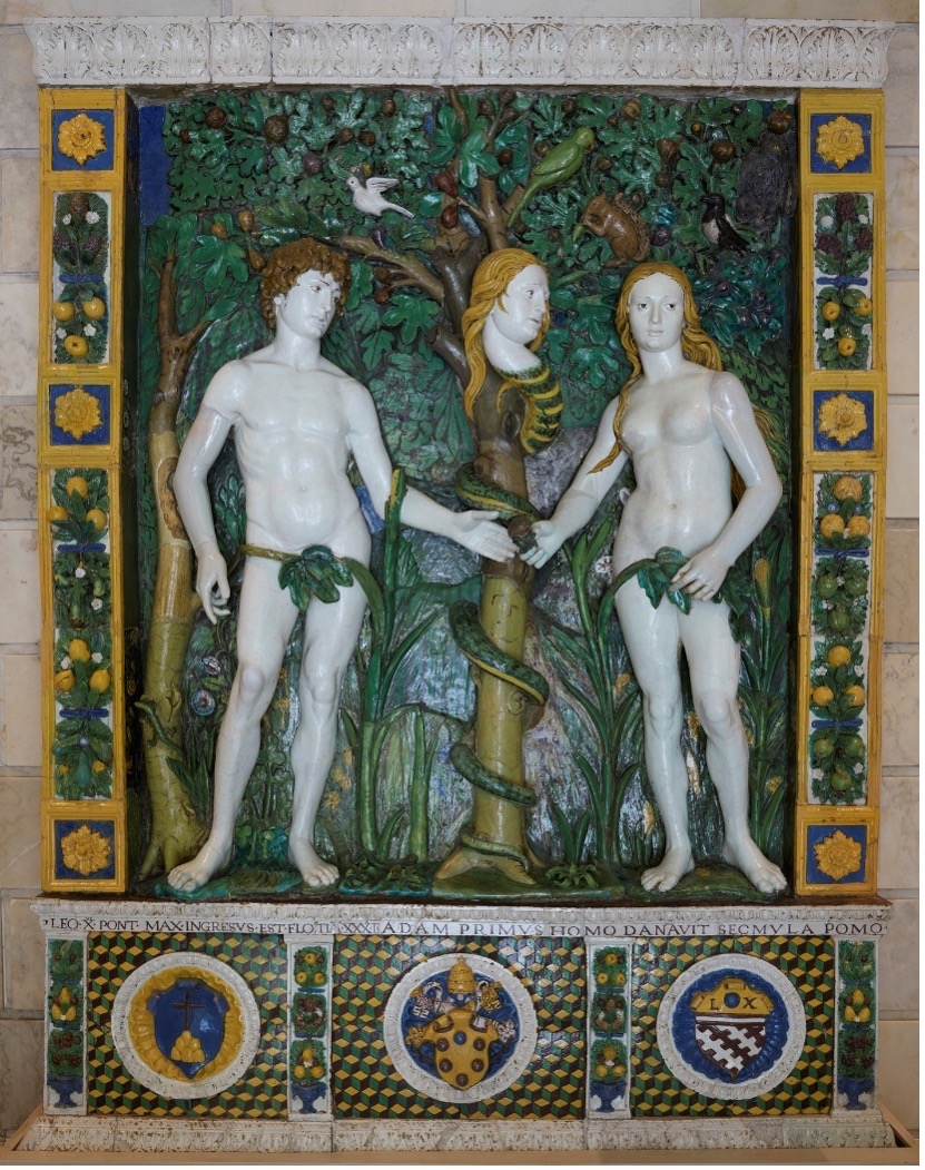 Ilyen például Giovanni della Robbia zománcozott terrakotta domborműve, amely ma a The Walters Art Múzeumban található. 8. KÉP A 279.5 x 212 centiméteres alkotáson – amelyet 1515-re datálnak – Ádám és Éva megszokott elrendezésükben szerepelnek a tudás fájának két oldalán.15 Ádám ismét apollónikus ábrázolásmódban jelenik meg, alakja egészséget és fittséget sugároz, izmai szépen kivehetőek. Éva gömbölyded, nőies, haja hosszú és arany színű. Alakjuk arányos és a reneszánsz testideálokat jól reprezentálják. A jó és rossz tudásának fája jelen esetben egy fügefa és a gyümölcs, melyet Éva átnyújt kedvesének szintén egy füge, valamint intim részeiket is ilyen levél takarja.16 Itt érdemes megemlíteni, hogy a Biblia nem konkretizálja az ember bukásakor elfogyasztott gyümölcs fajtáját és a korai keresztény időszakban a legnépszerűbb választások a füge, szőlő és citrom voltak.17 A dombormű háttere sűrű és változatos növényzet, amelyet kistetű állatok tarkítanak. Ebben az időszakban népszerű lesz az állatok elhelyezése a genezis első négy könyvének bármely történetét bemutató ábrázolásokon.
