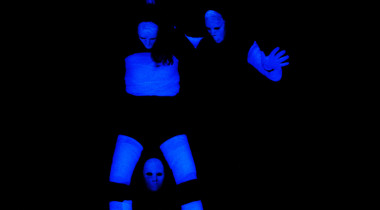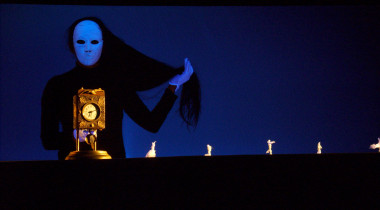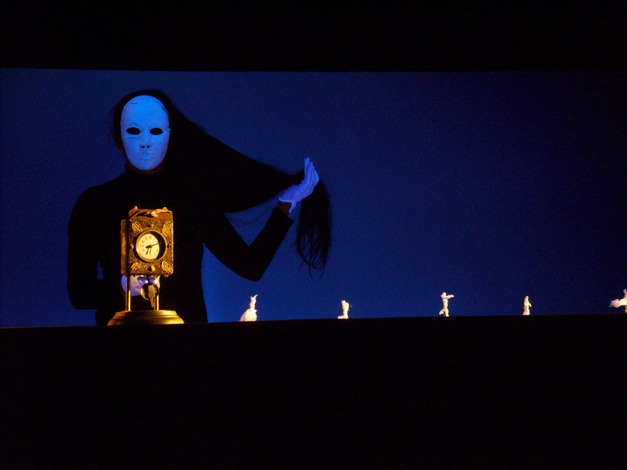 Az első képben UV-fénnyel megvilágított semleges maszkos figurákat látunk, összesen hármat. A maszk az egyetlen közös bennük, mert egyik figurának a karjai és kézfejei láthatóak, a másiknak a lábszára és lábfeje, a harmadiknak pedig a felső combja és felsőteste van megvilágítva. Ezek a testrészek elveszetten forgolódnak a térben, míg egyszer csak összeállnak és megformálják az embert, majd a kép végére ismét darabokra hullanak. KÉP A Azt feltételeznénk, hogy ami ezután következik, az ezzel az emberrel fog történni. Igencsak meglepő tehát, hogy a második jelenetben lyukas kalapok úszkálnak a semmiben, ugyancsak az UV-fény által megvilágított térben. Közös légzés történik, majd mintha beszélgetnének, eldöntenék a világ sorsát, ám mindez az ember számára nem érthető, halandzsa nyelven történik. A harmadik jelenetben egy paravánt látunk, mögötte nagy vászon, ugyanaz, mint amin a színészek arcát is láthattuk. A paraván vonalán elindulnak a pöfékelő ládák. Állandó, repetitív hangokat hallhatunk, amelyek vonatra, esetleg gyárra emlékeztetnek. Szemléltetik az idő múlását, ugyanis a vászonra vetített hold nagyon lassan elmozdul. A negyedik képen hosszú hajú, semleges maszkos nő bukkan fel a paraván mögül, egy órával a kezében. KÉP B Nonfiguratív, kis, emberszerű alakok mintha az órából érkeznének, közben gyermeksírás hallatszik. Méretük rendkívül kicsi, mintha alig néhány centiméternyi gézdarabok lennének. Az óra ketyegése hallható a zenéből, az inga pontosan erre a ritmusra mozog.