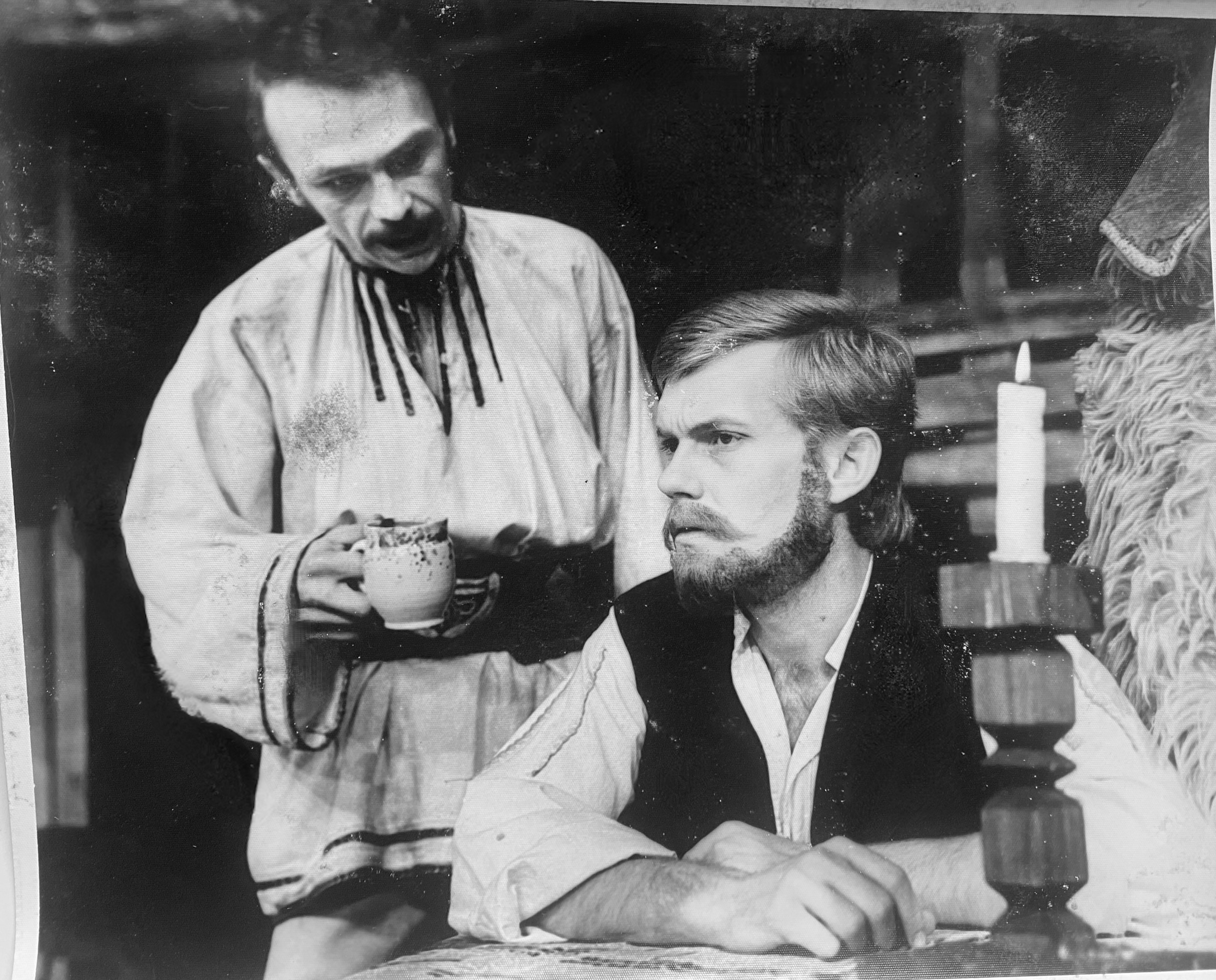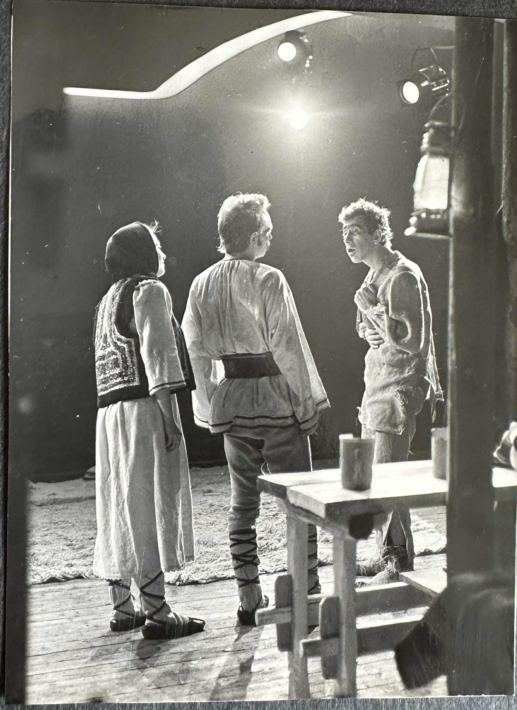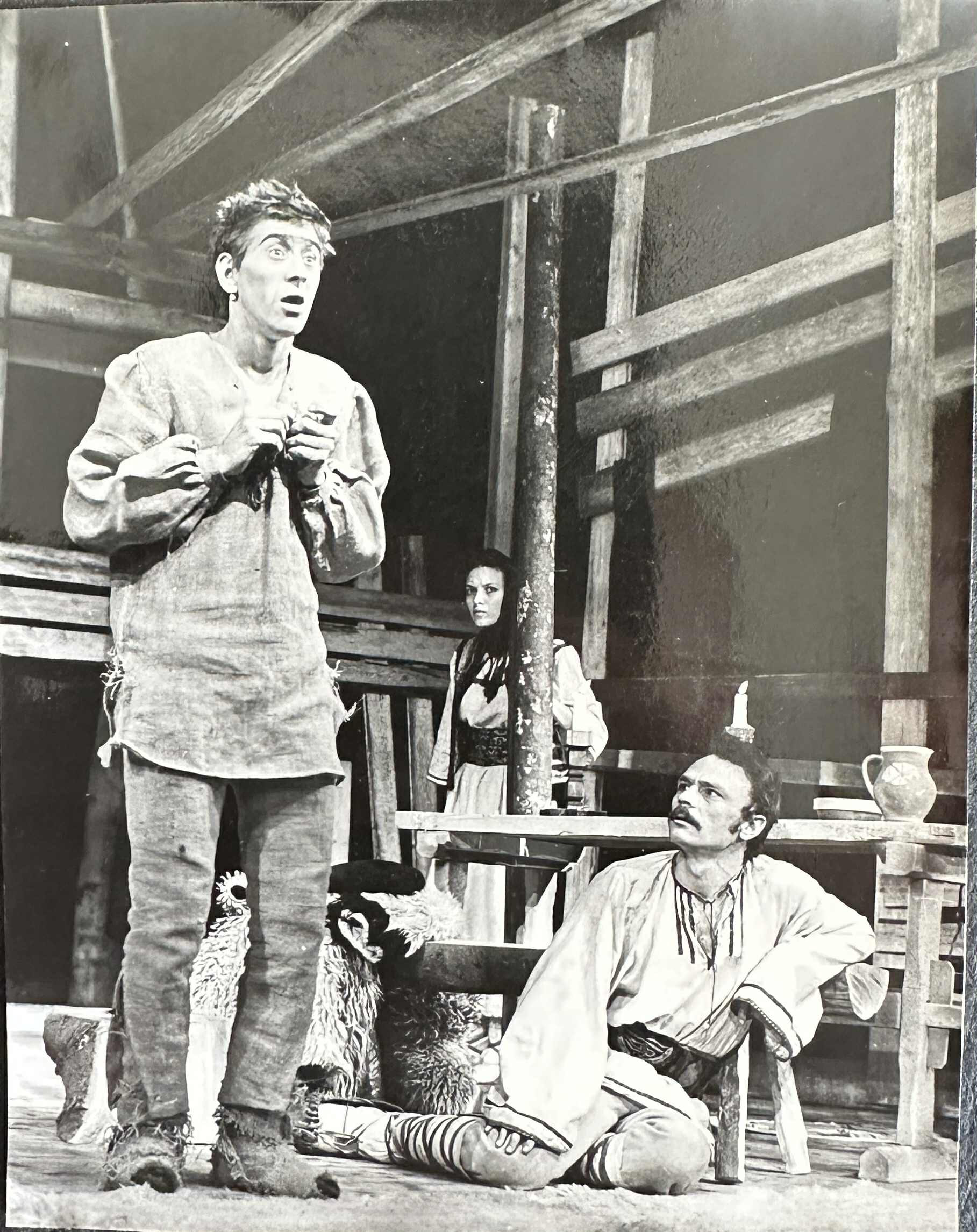 A fotók tanúsága szerint a színpadkép finoman absztrakt módon követi a szöveg utasításait, a gerendás kocsmaépület ívóját, a padokat és falakat rácsos faszerkezet jelzi, melyet népies agyagedények és a falusi gazdaságokra jellemző használati tárgyak tesznek rusztikussá. KÉP E A fából faragott gyertyatartókban égő gyertyák egészítik ki az ellenfényeket hasznosító világítást. A szereplők hagyományos román népviseletben játszanak. KÉP F Fülöp Zoltán sminkje a többi szereplőénél erősebb, expresszívebb, ezt a börtönből megszökött és az őrület határára kerülő szereplő állapota, az alakítás megközelítése is indokolja. KÉP G