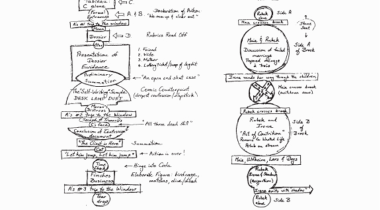 Scanlan pays particular attention to Robert Wilson, whom he frequently refers to in the text. Wilson himself always works with plot diagrams he developed himself (perhaps this also played a role in Scanlan’s plot-bead fantasy, which is another argument against the impracticality of the method), sketching out all his ideas, much like a graphomaniac feels compelled to constantly write things down. Wilson’s characteristic drawings set up comic-like storyboard frames in which he visually illustrates the plot. KÉP 2