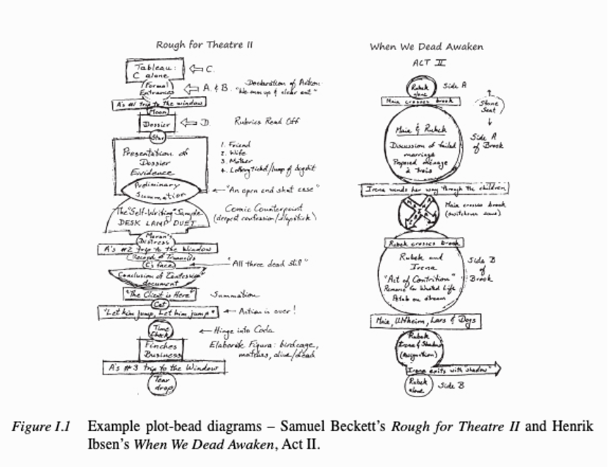 Although Scanlan emphasises that his plot-beads apply to a wide variety of radically different plays, his choices could be much bolder. It would have been interesting, for example, to bring out avant-garde works that have been pushed to the periphery, whose plot-bead diagram analysis could lead to surprising insights. In the absence of extreme examples, Scanlan’s basic premise carries less weight, and the revelatory power of his arguments, at least for me, is lacking. Although Beckett’s dramaturgy and stylised language take a bolder direction, Scanlan does not use truly performative or contemporary examples but sticks to the world-famous Wilson and the well-established classics (Ibsen, Shakespeare). It may be that he had no intention of illustrating his analytical structure with post-dramatic works, which he considers problematic anyway, but it would have been more authentic and exciting to illustrate his analytical structure through works in which linear-narrative understanding is less obvious and clear, and whose formal exploration is therefore more challenging. This would have allowed the book to appeal to a wider audience.9