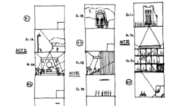 His images are proscenium-framed viewpoints of the dominant geometry of each scene, so their primary abbreviations are spatial rather than temporal in nature. Wilson arranges the spatial viewpoints in chronological order, the form and direction of which correspond to the plot-bead diagram; similarly to the diagram, the figure presents the form of the entire performance from a single viewpoint. Wilson’s scene-framed storyboards summarise the entirety of the dramatic composition. Scanlan looks up to the formalist theatre director as a role model, who works in clear and transparent forms despite a stage language based on a different kind of sensuality, generally eschewing linearity and narrativity, and whose managers, assistants, and dramaturgs work separately on the formal documentation of each production.