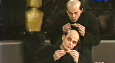Tompa Gábor 1996-ban a budapesti Művész Színházban ismét színpadra állította a Tartuffe-öt. Ez a produkció külsőségeiben megegyezett a marosvásárhelyivel.14 A tervező ezúttal is Dobre-Kóthay Judit volt, aki itt is kétszintes teret alakított ki, de a felső szintnek csak a középső, az üveg/plexi ajtók labirintusának szakasza vált hangsúlyossá. A pesti előadásból kimaradt Orgon hazatérésekor a kereszt becipelése, és az ebből következő további játékötletek is elmaradtak. De a vásárhelyi színi megoldások többsége (például Tartuffe asztali keresztre feszítettségi póza, Orgon és Tartuffe „piétája”, Elmira és Tartuffe asztali jelenete stb.) átültetődött a fővárosi produkcióba is. A vásárhelyi együttes egységes játékstílusán belül minden színész egyként jelentőssé tudott válni, az alakítások nem váltak el fő-és mellékszerepekké. Ez az egység a Thália előadásában nem született meg. Eperjes Károly (Tartuffe), Bánsági Ildikó (Elmira), Keresztes Sándor (Lőrinc) és Blaskó Péter (Orgon) értő megvalósítói voltak a rendezői elképzeléseknek. Ők merték és tudták vállalni a túlzó, a realista színjátszástól elütő, commedia dell’ arte-típusú játékmódot (például ahogy a IV. felvonásban Bánsági torokmélyről indított és fejhangig terjedő skálán végigmodulált dallamsorral reagált Tartuffe akcióira, s közben beszédes játékot űzött a legyezőjével). Természetesen ez a rendezés is a Bryan Adams-klippel zárult.